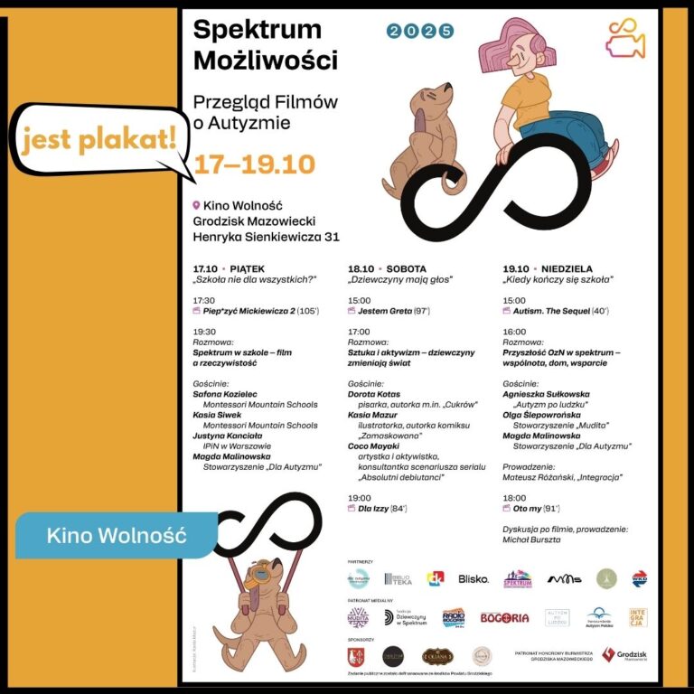 Szanowni Państwo, serdecznie zapraszamy nauczycieli, rodziców oraz uczniów do udziału w II Przeglądzie Filmów o Autyzmie „Spektrum możliwości”, który odbędzie się w dniach 17–19 października w Kinie „Wolność” w Grodzisku Mazowieckim. Przegląd to wyjątkowa okazja, aby poprzez filmy i rozmowy lepiej zrozumieć temat spektrum autyzmu. W programie znalazły się projekcje