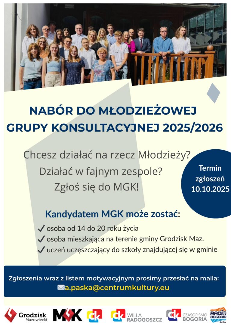 Chcesz działać lokalnie na rzecz młodzieży? Dołącz do Młodzieżowej Grupy Konsultacyjnej! Szczegóły na plakacie.