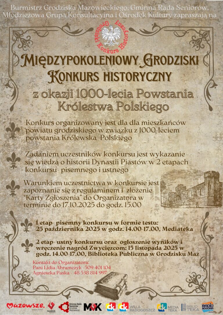 Zachęcamy jednocześnie do wzięcia udziału w Międzypokoleniowym Grodziskim Konkursie Historycznym z dynastii Piastów organizowanym przez Willę Radogoszcz wraz z Gminną Radą Seniorów oraz Młodzieżową Grupą Konsultacyjną dla uczniów ze szkół i Seniorów. Więcej informacji na plakacie.