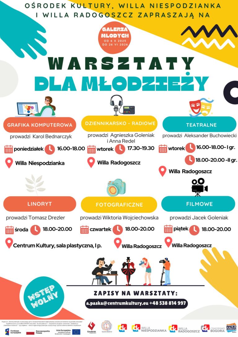 Halo Młodzież z gminy Grodzisk Mazowiecki i okolic Od przyszłego tygodnia w Willa Radogoszcz rozpoczynają się bezpłatne warsztaty dla Młodzieży w ramach projektu „Galeria Młodych 2025/2026”. Jest jeszcze kilka wolnych miejsc na grafikę komputerową, warsztaty dziennikarsko-radiowe, warsztaty fotograficzne i filmowe oraz linoryt, więc zapisujcie się szybciutko na email: a.paska@centrumkultury.eu lub