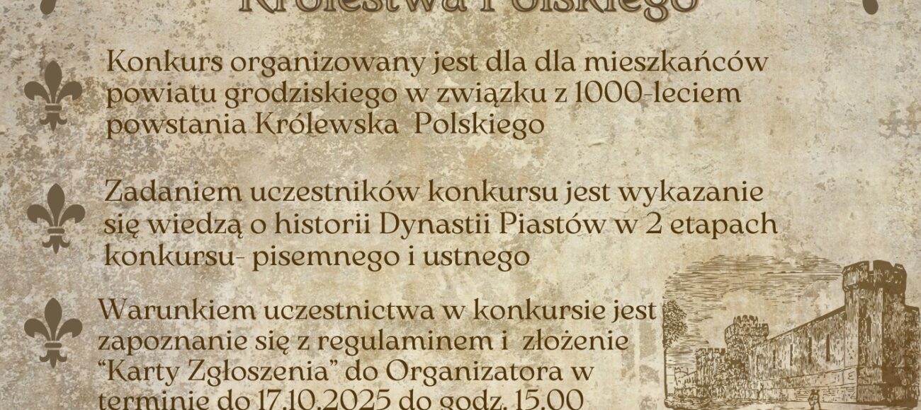 Zachęcamy jednocześnie do wzięcia udziału w Międzypokoleniowym Grodziskim Konkursie Historycznym z dynastii Piastów organizowanym przez Willę Radogoszcz wraz z Gminną Radą Seniorów oraz Młodzieżową Grupą Konsultacyjną dla uczniów ze szkół i Seniorów. Więcej informacji na plakacie.
