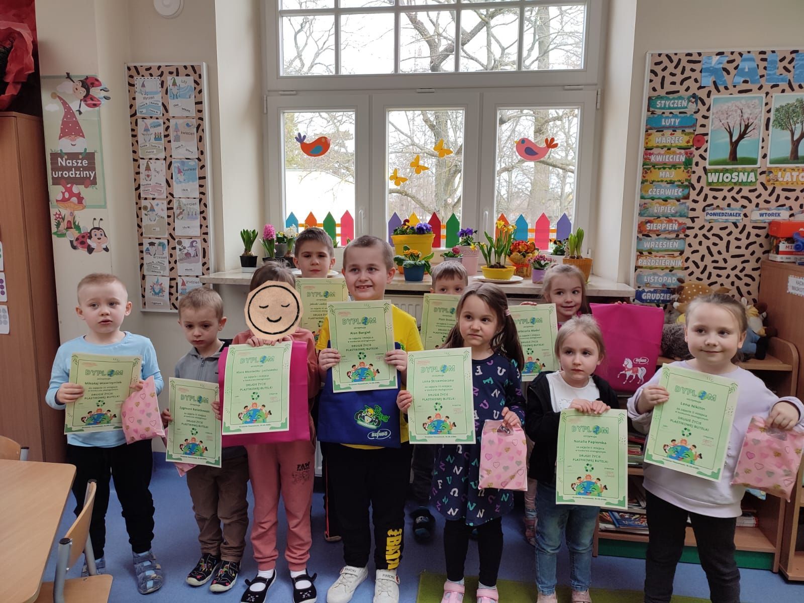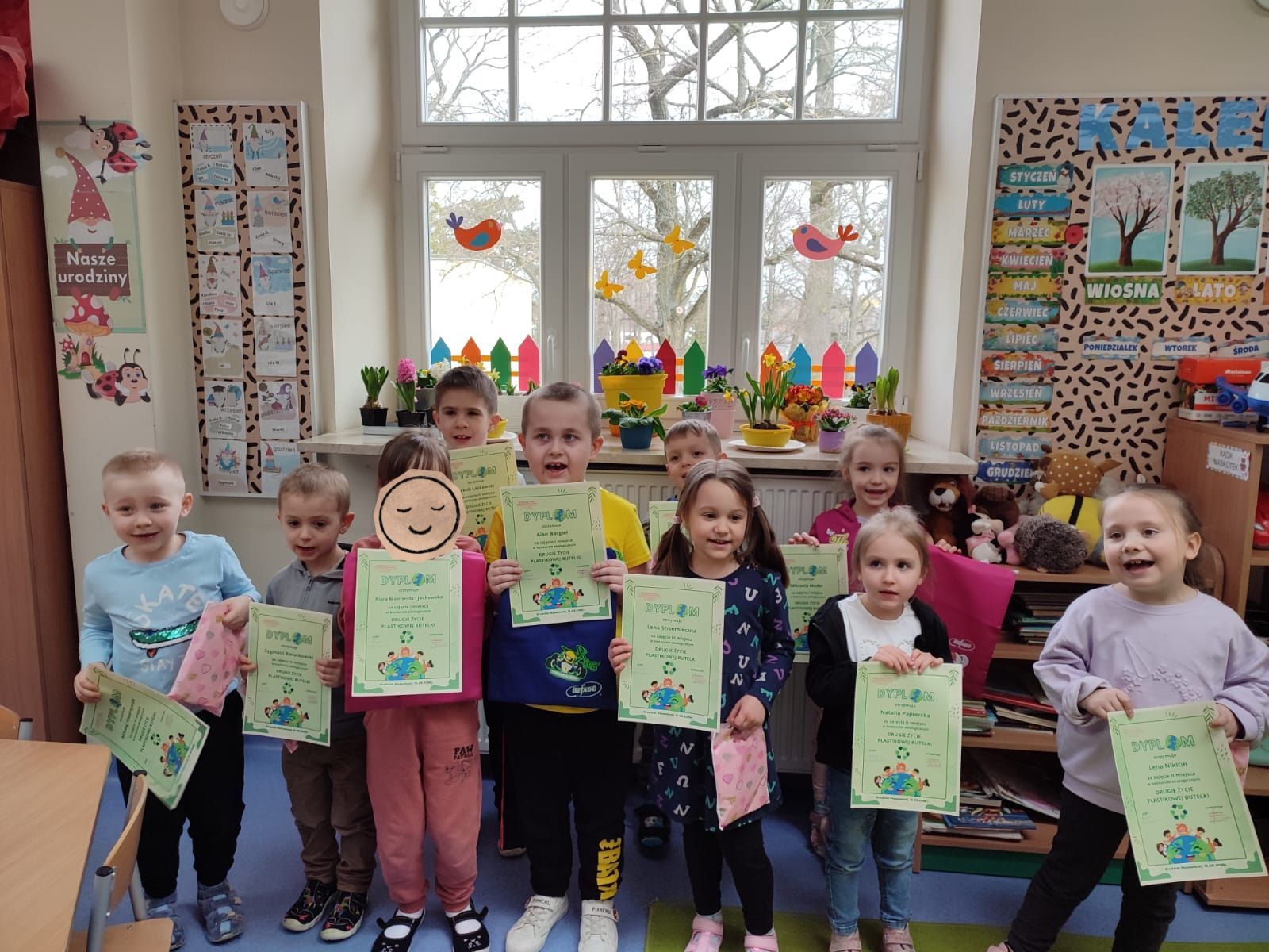 18 marca w naszym przedszkolu został rozstrzygnięty konkurs ekologiczny pt. „Drugie życie plastikowej butelki” zorganizowany z okazji Światowego Dnia Recyklingu. W konkursie wzięło udział 12 dzieci. Wszystkie prace były pomysłowe i ukazywały jak zamienić zwykłą butelkę np. w zabawkę czy doniczkę z roślinką. Każdy przedszkolak biorący udział w konkursie otrzymał dyplom oraz drobny upominek, który nagrodził wkład i zaangażowanie. Gratulujemy!