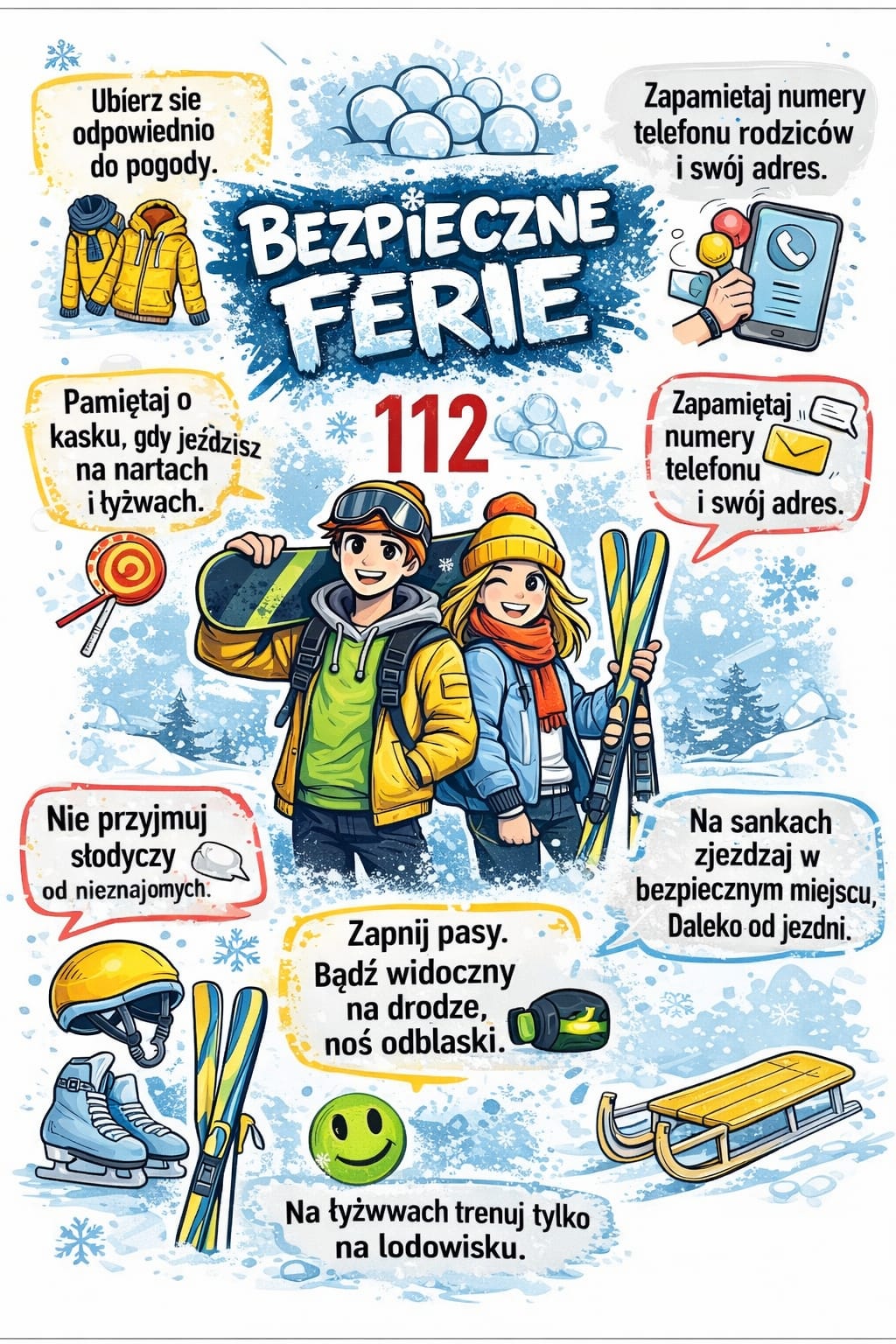 Ferie zimowe tuz-tuż. Ważne jest, aby były one czasem odpoczynku, ale przede wszystkim muszą być bezpieczne! Dlatego w tym tygodniu we wszystkich klasach poruszamy ważną tematykę bezpieczeństwa zimą. W młodszych klasach odbędą się także szkolne apele poświęcone bezpieczeństwu.