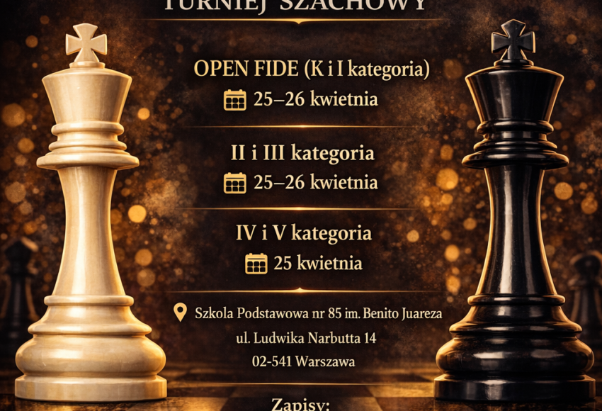 Serdecznie zapraszamy naszych uczniów do wzięcia udziału w turnieju szachowym „Droga do Mistrzostwa”, który odbędzie się w Warszawie. Turniej skierowany jest do młodzieży szkolnej – zarówno do początkujących miłośników szachów, jak i bardziej zaawansowanych zawodników, którzy chcą rozwijać swoje umiejętności oraz zdobywać wyższe kategorie szachowe. Terminy i kategorie: 25–26.04.2026 – […]
